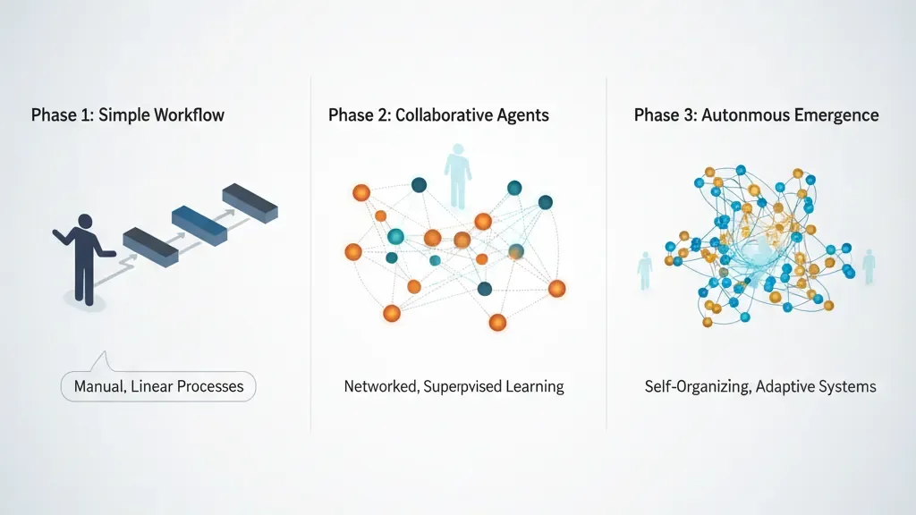 In Phase 1, humans design workflows. Agent A handles queries, Agent B accesses databases, Agent C synthesizes responses. The supervisor routes tasks according to rules that developers hardcoded. The system operates within strict boundaries. Intelligence remains tool-like: powerful, but fundamentally directed by human intent.